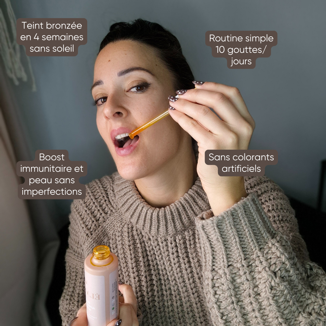 Et si le soleil s'invitait dans votre verre ? Quelques gouttes chaque jour, et votre peau s'éveille doucement, comme après une semaine au bord de la mer...