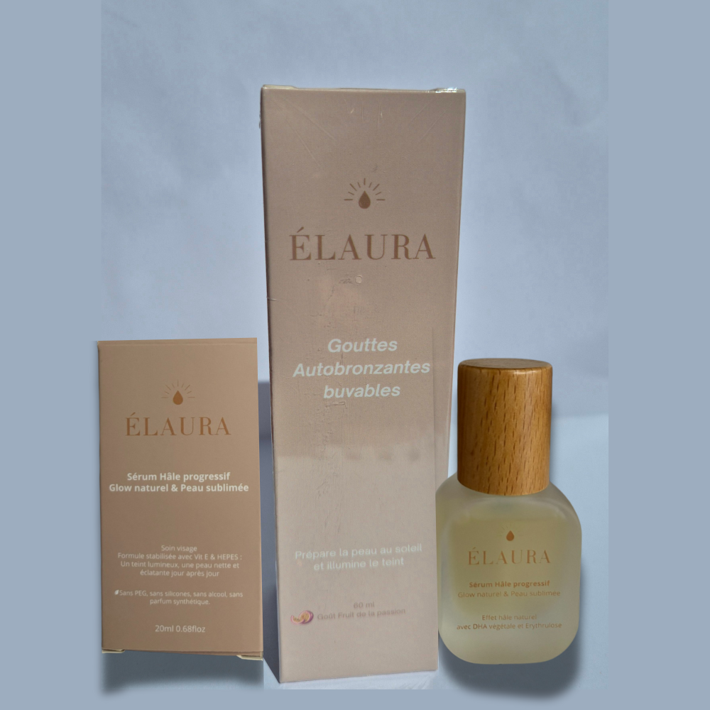 Avec l'alliance des gouttes solaires buvables et du sérum hâle progressif, la peau s'illumine de l'intérieur comme de l'éxtérieur.