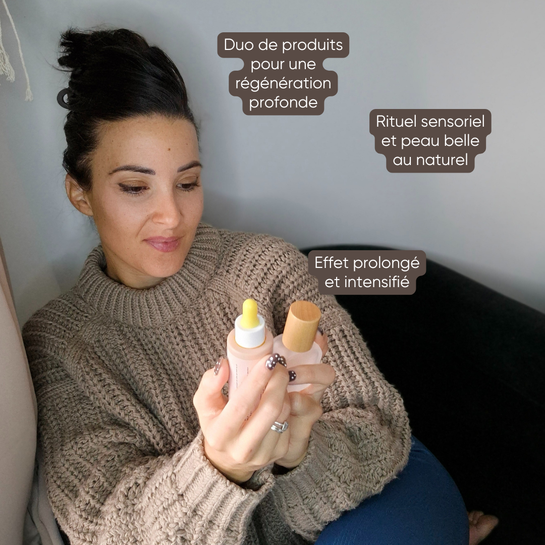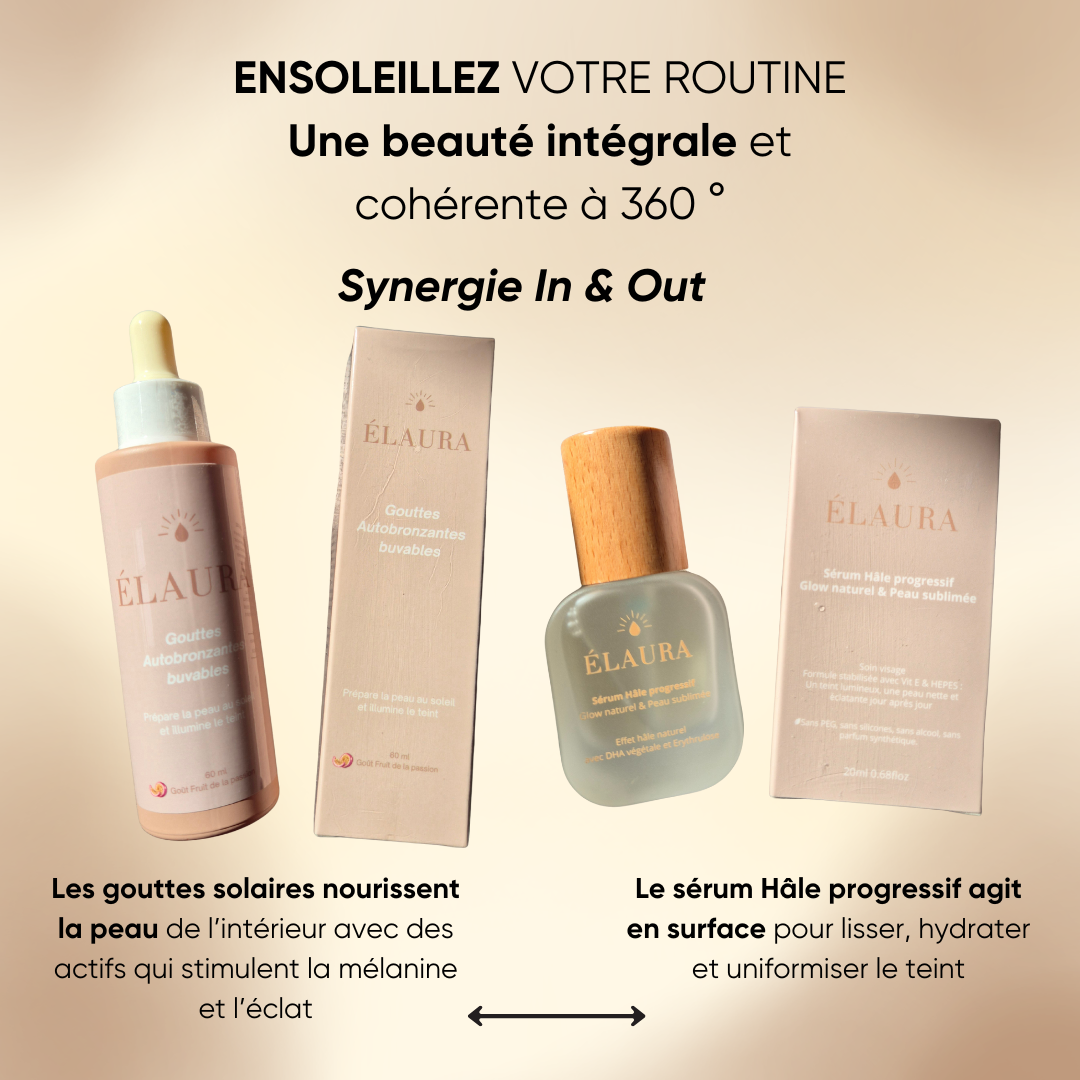Avec l'alliance des gouttes solaires buvables et du sérum hâle progressif, la peau s'illumine de l'intérieur comme de l'éxtérieur.
